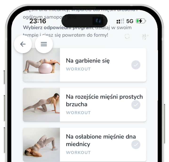 - Program trwa 12 tygodni i obejmuje stopniowe wprowadzanie bardziej zaawansowanych ćwiczeń, które wspierają Twoją regenerację i powrót do formy.
